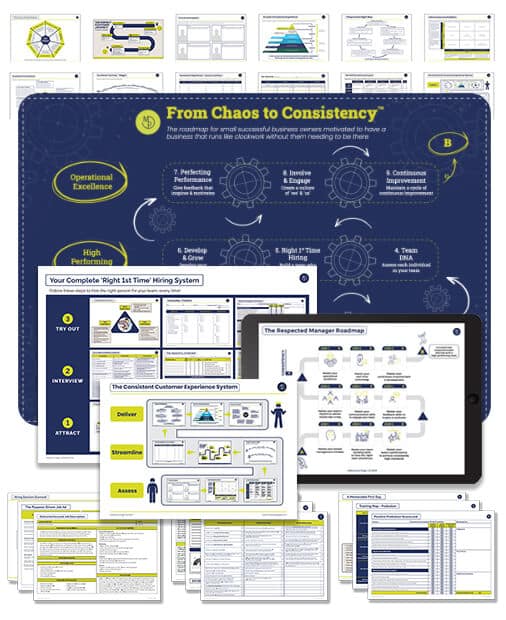 This 90 day programme follows a clear and structured roadmap which (as the name suggests) will take your clients from where they are now [perhaps chaotic, but more likely disorganised, inefficient and frustrated by the inconsistencies in their operation] to where they want to be [with a business that runs like clockwork, whether they are there or not].